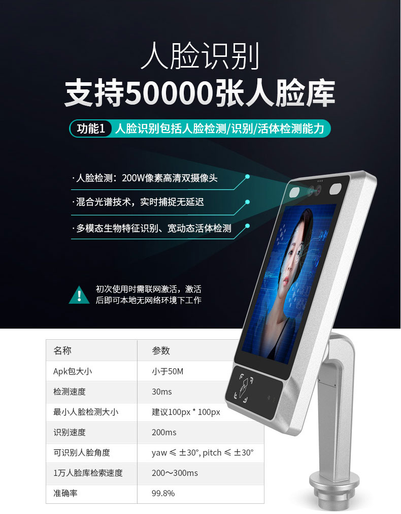·8英寸高清顯示屏,搭載混合光譜技術,精準、實時捕捉人臉信息;