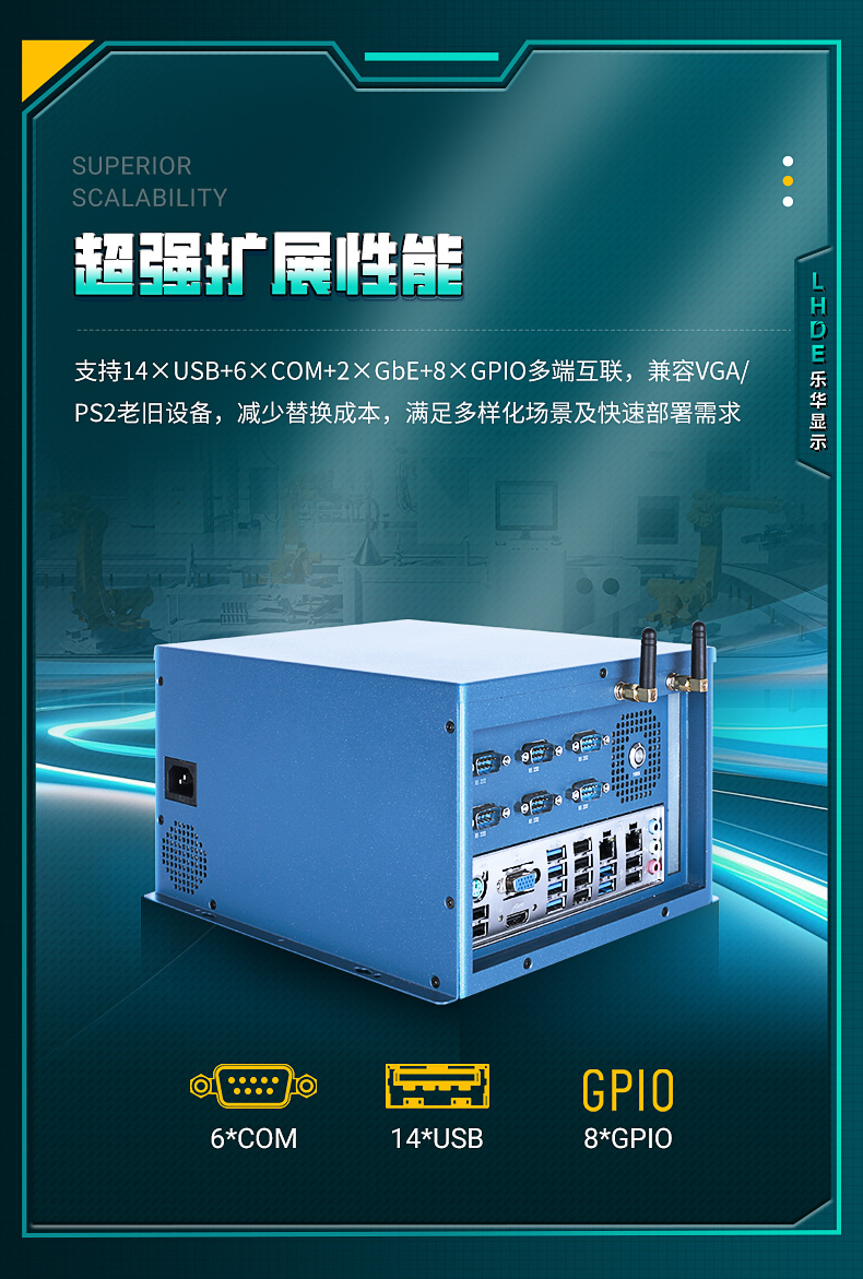 接口部分支持14×USB+6×COM+2×GbE+8×GPIO多端互聯,兼容VGA/PS2老舊設備,滿足多樣化場景及快速部署需求。